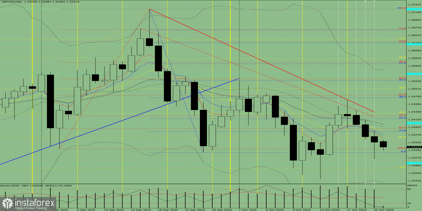 From the 1.3351 level (the closing price of yesterday's daily candle), the price may continue moving down toward 1.3322 – the lower fractal (blue dotted line). From this level, the price may rebound upward toward 1.3332 – the lower fractal (red dotted line).
