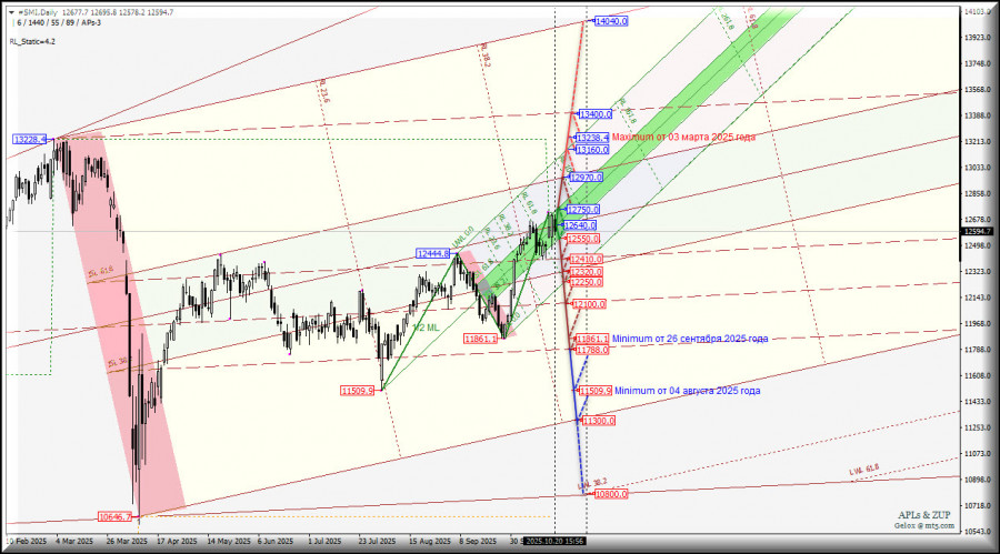 Развитие движения #SMI-Daily с 21 октября 2025 года будет обусловлено границами зоны равновесия (12320.0 - 12640.0 - 12970.0) вил старшего операционного масштаба Minor-Daily, а направление этого движения будет определяться отработкой и направлением пробоя границ зоны равновесия (12550.0 - 12640.0 - 12750.0) вил младшего операционного масштаба Minute-h4.