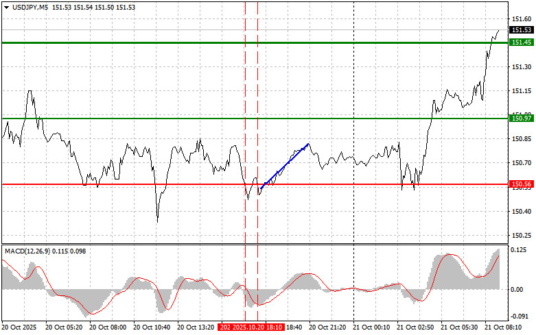 Сценарий №2: покупать USD/JPY сегодня также планирую в случае двух подряд тестов цены 151.28, в момент, когда индикатор MACD будет находиться в области перепроданности. Это ограничит нисходящий потенциал пары и приведет к обратному развороту рынка вверх. Можно ожидать рост к противоположным уровням 151.70 и 152.27.