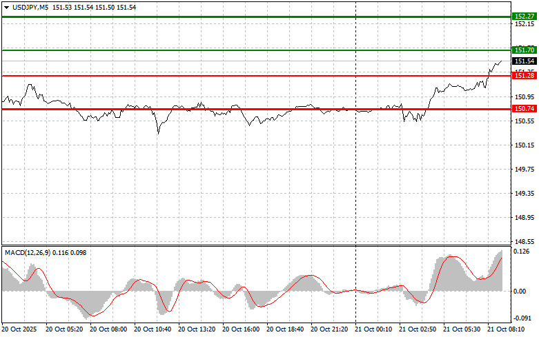 Сценарий №2: продавать USD/JPY сегодня также планирую в случае двух подряд тестов цены 151.70, в момент, когда индикатор MACD будет находиться в области перекупленности. Это ограничит восходящий потенциал пары и приведет к обратному развороту рынка вниз. Можно ожидать снижения к противоположным уровням 151.28 и 150.74.