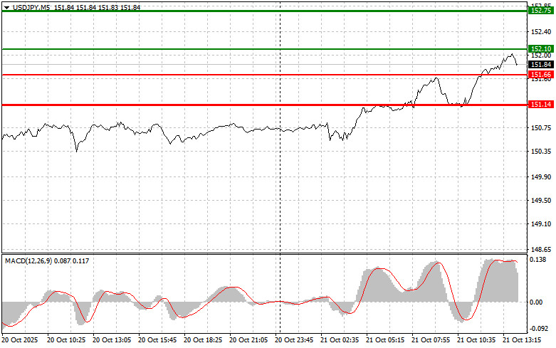 Сценарий №1: покупать USD/JPY сегодня планирую при достижении точки входа в районе 152.10 (зеленая линия на графике) с целью роста к уровню 152.75 (более толстая зеленая линия на графике). В районе 152.75 буду выходить из покупок и открывать продажи в обратную сторону (расчет на движение в 30-35 пунктов в обратную сторону от уровня). Рассчитывать на рост пары можно и дальше в рамках нового тренда. Важно! Перед покупкой убедитесь в том, что индикатор MACD находится выше нулевой отметки и только начинает свой рост от нее.