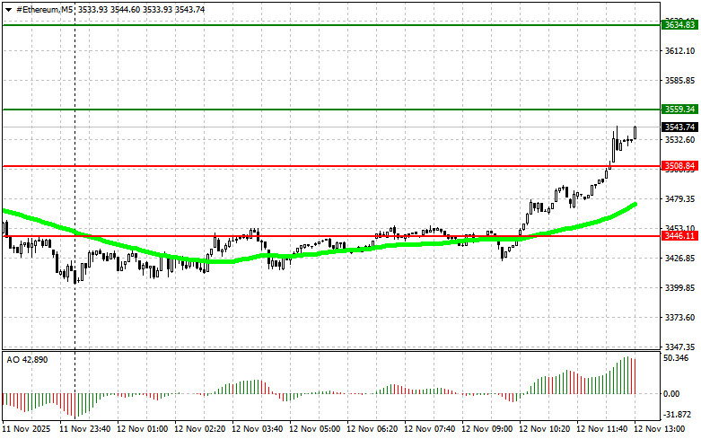 Сценарий №2: покупать эфир можно от нижней границы $3508 при отсутствии рыночной реакции на ее пробой в обратную сторону к уровням $3559 и $3634.