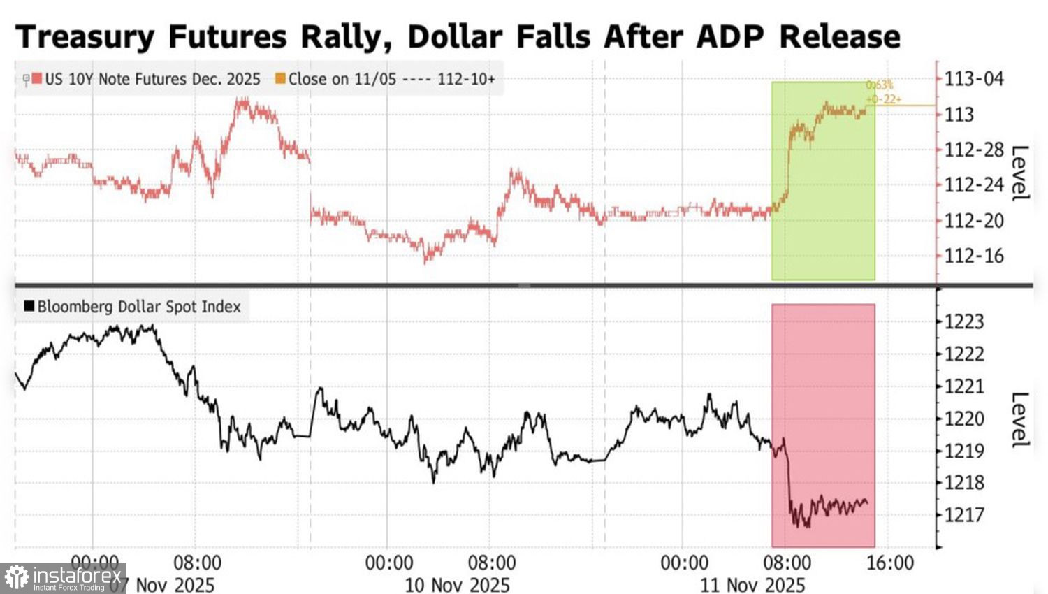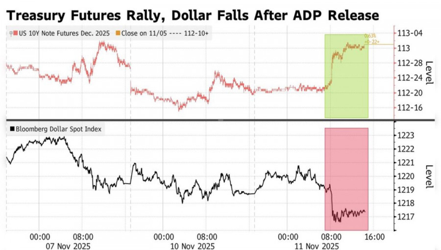 Вместе с тем индекс USD довольно спокойно отреагировал на снижение недельной занятости в частном секторе от ADP и на пугающий прогноз Goldman Sachs о сокращении non-farm payrolls в октябре на 50 тыс. После таких известий шансы на снижение ставки по федеральным фондам на декабрьском заседании FOMC лишь незначительно выросли, а доходность казначейских облигаций отступила.