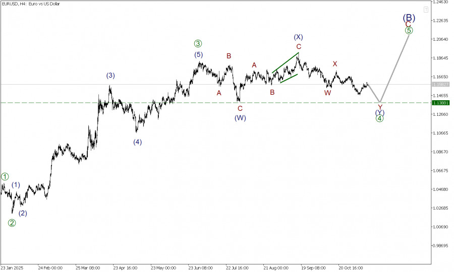 На последнем участке графика мы можем наблюдать развитие бычьей волны C, которая, по всей видимости, принимает форму импульса. На текущий момент завершены первые три его части - подволны [1]-[2]-[3]. В процессе построения сложная коррекционная волна [4].