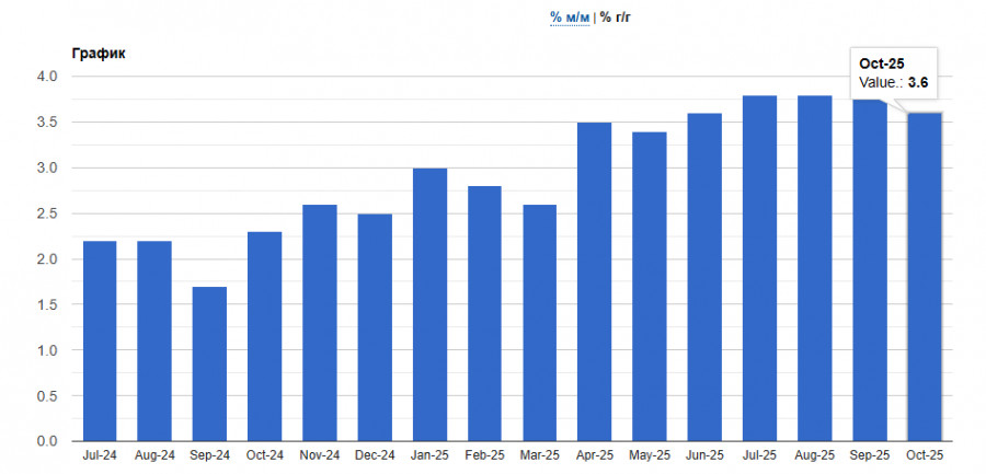 В отчете указано, что потребительские цены выросли на 3,6% в октябре по сравнению с аналогичным периодом предыдущего года, что ниже роста на 3,8% в сентябре. Однако данные немного превысили ожидания экономистов, ожидавших снижения инфляции до 3,5%.
