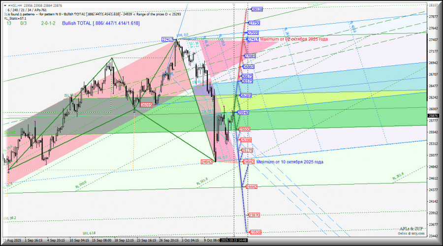 Развитие движения Hang Seng Index-h4 с 16 октября 2025 года будет обусловлено отработкой и направлением пробоя границ зоне равновесия вил операционных масштабов - старшего-Minute-h4 (25600 - 25940 - 26285) и младшего-Minuette-h1 (25940 - 26285 - 26757) - подробности отработки данных уровней смотрим на графике ниже.