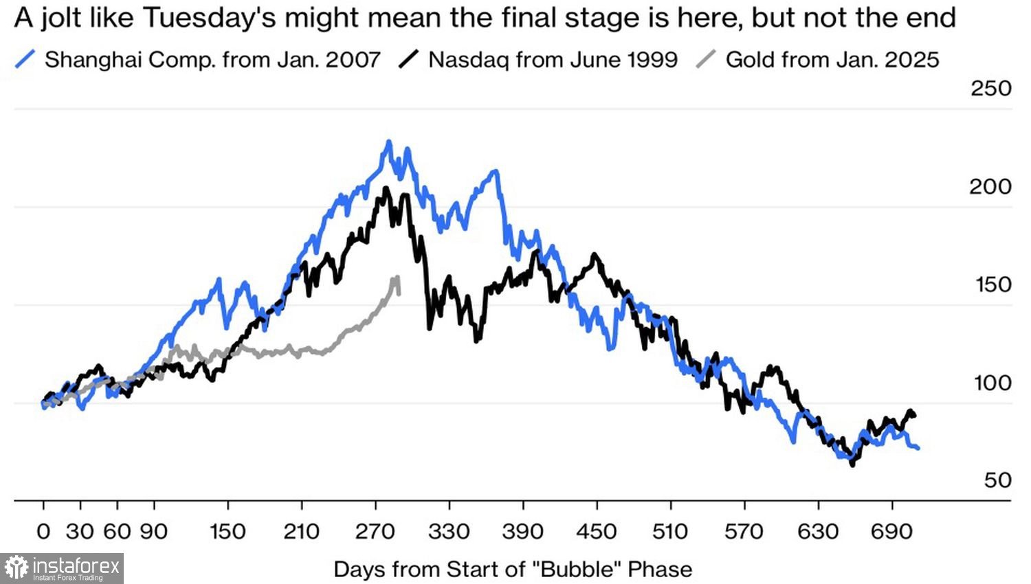 В последнее время драгметалл рос по гиперболе, без каких-либо коррекций в направлении строго на север. Такие события происходят крайне редко и рано или поздно приводят к лопнувшим пузырям. Так было с американским NASDAQ в 1999 и китайским Shanghai Composite в 2007. Особенностью агрессивных рынков «быков» является их неустойчивость на последней экстремальной фазе.