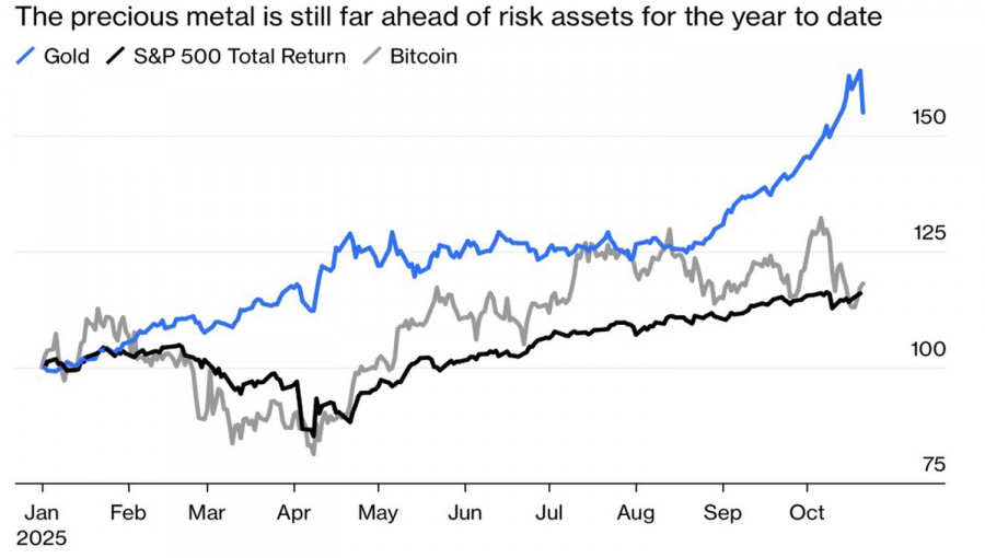 Кто высоко взлетает, больно падает. Золото едва не коснулось отметки $4400 за унцию, прежде чем попало в лавину распродаж. Котировки XAU/USD рухнули на 5,7% за сутки, самыми быстрыми темпами в процентном отношении за почти дюжину лет. В долларовом эквиваленте просадка на $230 является самой большой в истории. Вряд ли такой разгром мог быть связан с деэскалацией торговых трений между США и Китаем.