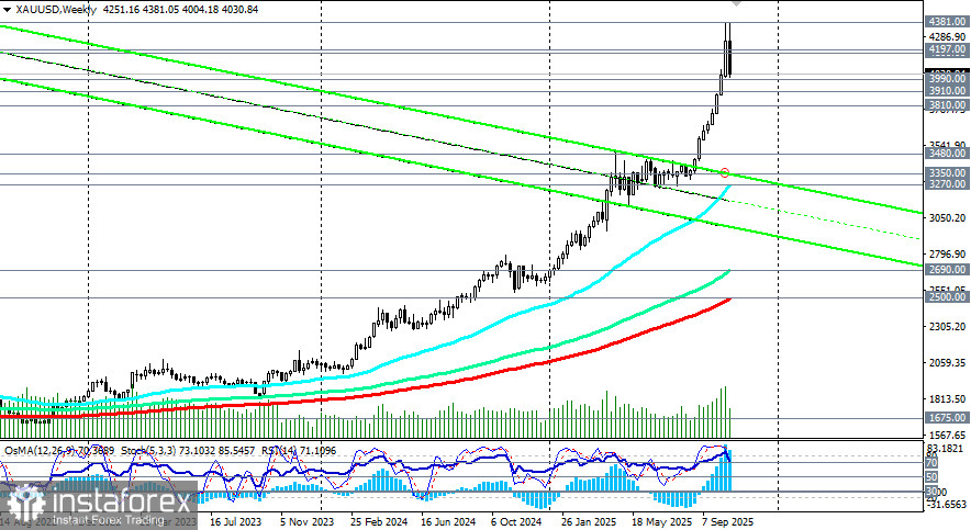 Общий тренд остается восходящим, а XAU/USD торгуется в зоне устойчивого бычьего рынка и выше ключевых уровней поддержки и, среднесрочного – выше 3350.00 (ЕМА200 на дневном графике), долгосрочного – выше 2500.00 (ЕМА200 на недельном графике). Общие перспективы актива остаются положительными, также говорят экономисты. Поэтому, любую коррекцию можно воспринимать как хорошую возможность войти в новые длинные позиции по более выгодным ценам. Более перспективным планом выглядит возобновление роста в сторону недавнего рекордного максимума 4381.00.