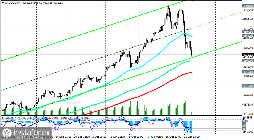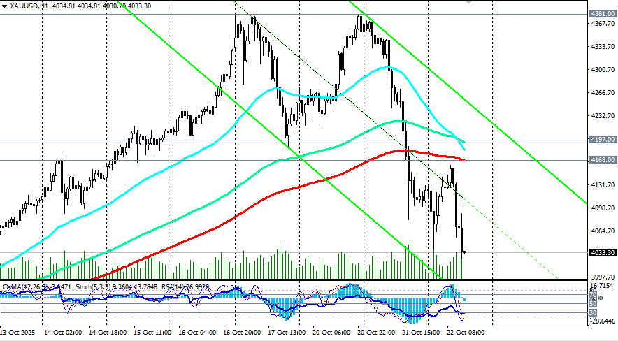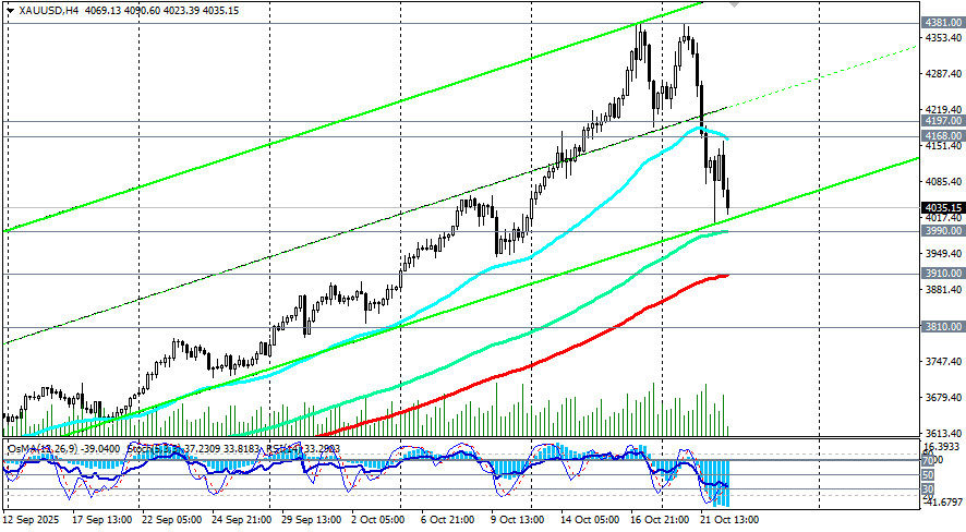 На момент публикации данной статьи, пара XAU/USD торговалась вблизи отметки 4033.00, на 8,6% (учитывая также и сегодняшнее падение в -2,4%) ниже рекордного максимума 4381.00, установленного еще в начале этой недели. После внушительного падения в минувший вторник и несмотря на многочисленные попытки восстановиться, котировки золота остаются под давлением. Более того, в начале сегодняшней азиатской торговой сессии они достигли нового 8-дневного минимума вблизи отметки 4005.00. Ситуацией вновь рулит геополитика, отметили мы в нашем сегодняшнем обзоре «XAU/USD: сильнейшее с 2020 года внутридневное падение».