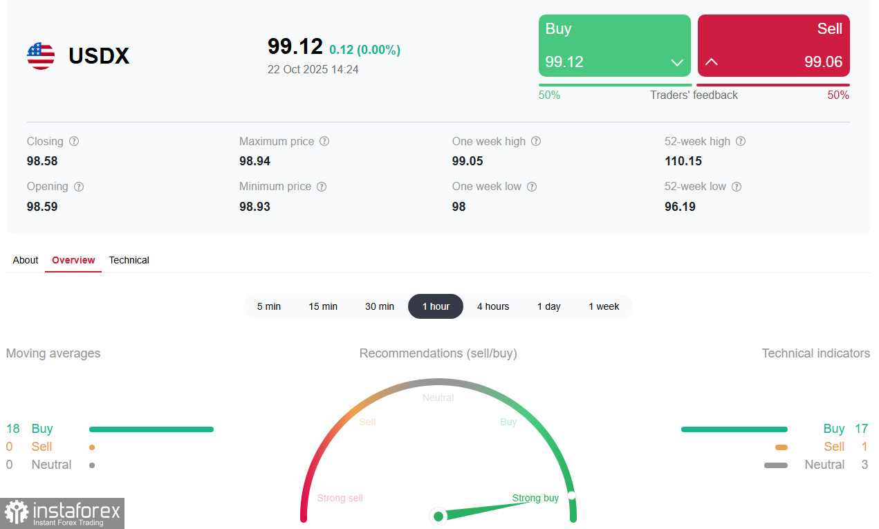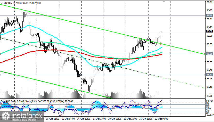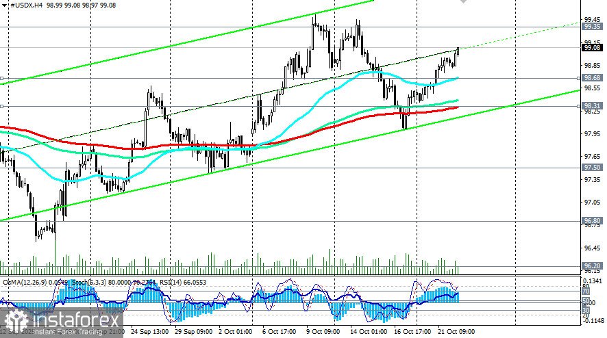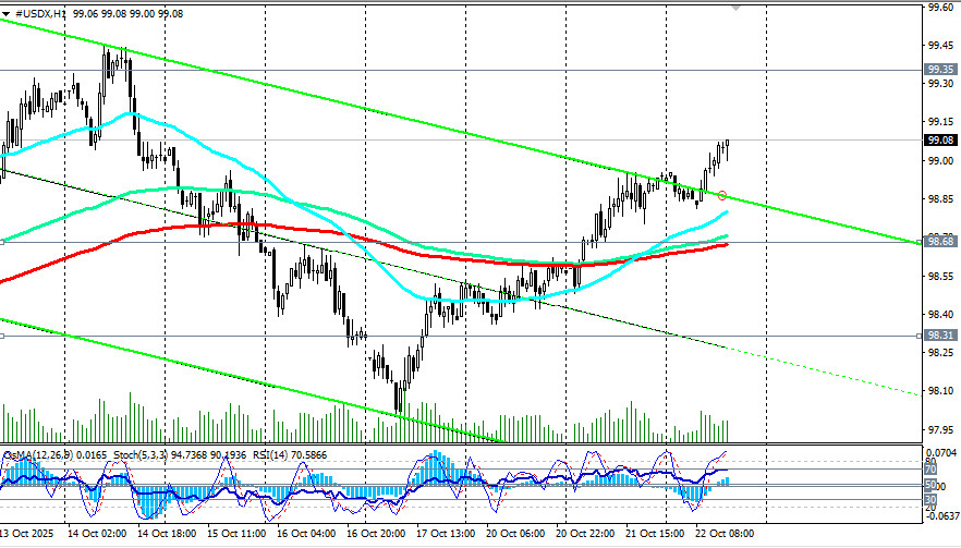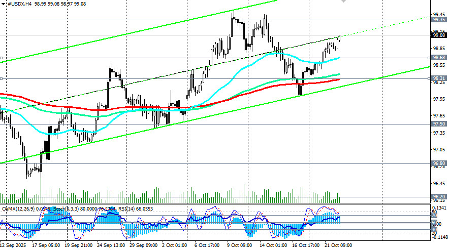 Несмотря на высокую волатильность на валютных рынках, индекс доллара USDX демонстрирует стабильность, сохраняя восходящую динамику в зоне краткосрочного бычьего рынка – выше уровней поддержки 98.68, 98.31 (200-периодные скользящие средние на 1-часовом и 4-часовом графиках).