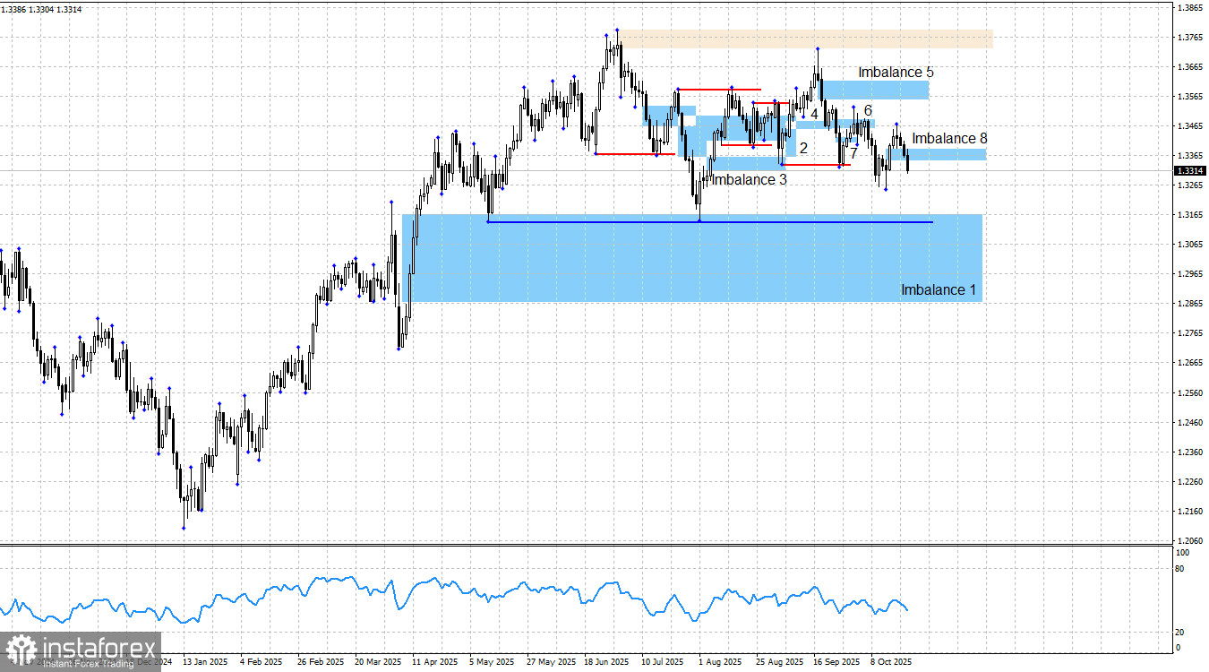 Пара GBP/USD начала процесс роста на прошлой неделе. Но как начала, так и закончила. Сейчас уже четвертый день подряд британец падает, а имбаланс 8, который служил опорой для него, никакой реакции цены не дал. Таким образом, с высокой долей вероятности этот имбаланс будет инвалидирован и превратится в «перевернутый имбаланс» – в «медвежий». Однако, чтобы это произошло, требуется падение котировок под последний «медвежий» свинг – 1,3247. Определенные шансы на возобновление роста сохраняются, но на этой неделе проводят атаки только медведи, а единственный важный отчет поддержал тоже медведей.