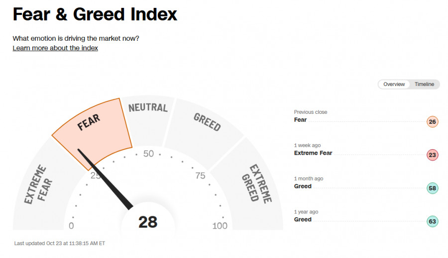 Между тем, так называемый «индекс страха и жадности» упорно держится в районе «страха», а сегодня – почти на границе с зоной «экстремального страха» и на отметке 28 (из 100 баллов). Почти две недели индикатор колеблется ниже нейтральных отметок. Это говорит о том, что инвесторы не оправились от обвала рынка 10 октября и больше склоняются к продажам рискованных активов, чем к их покупкам.
