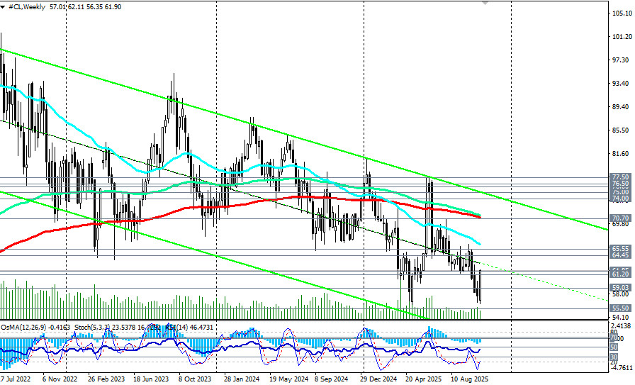 Несмотря на этот рост, цена остается в зоне медвежьего рынка, ниже ключевых уровней сопротивления 65.55 (ЕМА200 на дневном графике), 70.70 (ЕМА200 на недельном графике).