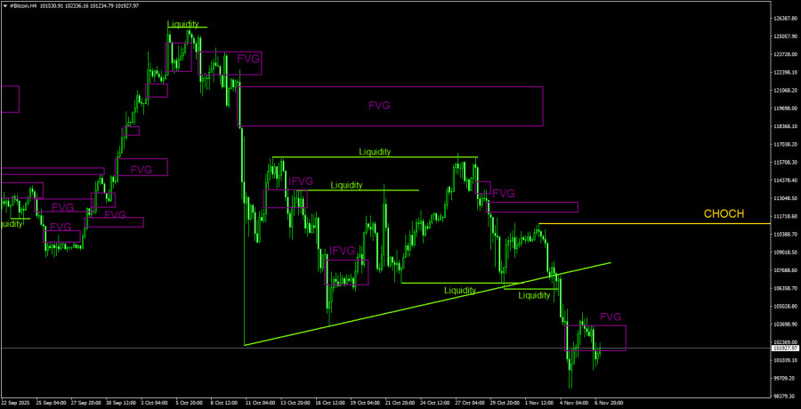 Однако в ближайшее время стоит ожидать восходящую коррекцию. На 4-часовом ТФ последний «медвежий» FVG пока не был проигнорирован, но реакция на него оказалась очень слабой. Таким образом, в краткосрочной перспективе рост может продолжится. Мы считаем, что дневной ТФ сейчас более важен, так как обвалы биткоина в последнее время очень неслабые. А на дневном ТФ у нас имеется главная область POI 104 700$ - 109 700$, внутри которой можно и нужно ожидать разворота вниз.