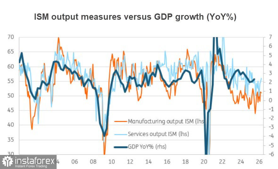 Рынок отреагировал укреплением доллара по всему спектру валютного рынка, что вполне объяснимо – рост деловой активности среди прочего означает более низкую вероятность снижения ставки ФРС. Отчеты ISM в целом верно прогнозируют динамику ВВП США, но проблема заключается в том, что сильный отчет ISM вступает в очевидное противоречие с другими отчетами, отражающими и ситуацию с занятостью, и экономическую активность.
