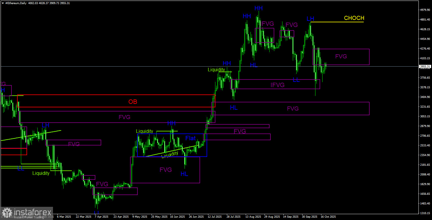 На дневном и 4-часовом ТФ восходящая тенденция отменена, падение может быть длительным и сильным. Ключевым паттерном на продажу выступал и выступает «медвежий» OB на недельном ТФ. Движение, спровоцированное этим сигналом, должно быть сильным и длительным. Ближайшими целями падения мы считаем области 3550-3715$ и 3085-3300$, которые представляют собой два «бычьих» FVG. Первая из них уже была отработана. На дневном имеется «медвежий» FVG, выступающий единственной областью POI на продажу, от которого цена уже получила реакцию.