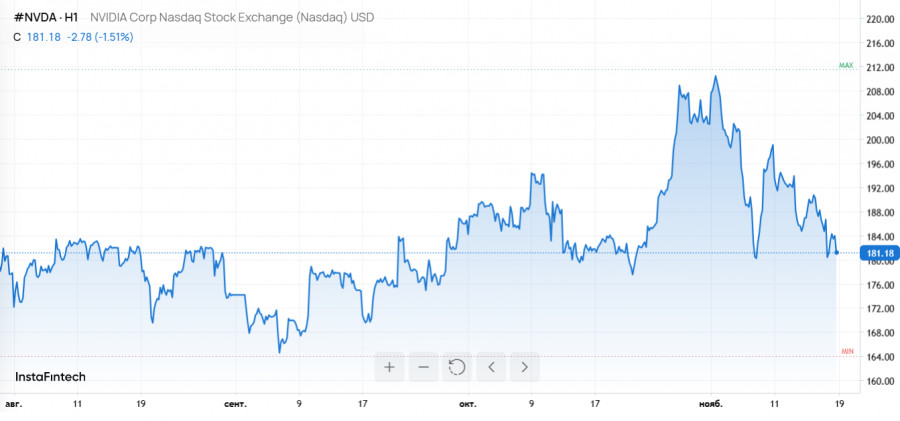Инвесторы с замиранием сердца ждут отчета Nvidia по итогам третьего квартала. Аналитики прогнозируют прибыль в размере $1,25 на акцию и выручку $54,9 млрд, что предполагает рост на 54% и 56% соответственно в годовом выражении.