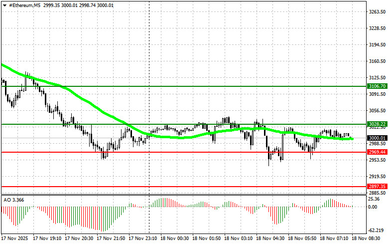 1-senariy: Bugun Ethereum'ni $3,028 atrofida xarid qilaman, maqsad $3,106 gacha o'sish. $3,106 darajasida xaridlarni yopaman va sakrashda darhol sotasiz. Xaridni breakoutda amalga oshirishdan oldin 50 kunlik o'rtacha chiziq hozirgi narxdan pastda, Awesome Oscillator esa noldan yuqorida ekanligiga ishonch hosil qiling.